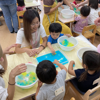 貝のおもちゃや、ビー玉、スポンジの魚などで遊んだり、泡を容器に入れて楽しむ姿が見られました。7月も水遊びがありますので、是非ご参加下さい。お待ちしています。